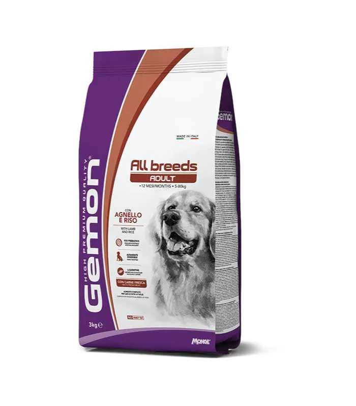 Monge Gemon sa Jagnjetinom i rižom je kompletna hrana za odrasle pse svih veličina. Formulaciju karakterišu sastojci vrhunskog kvaliteta kao što su janjetina, izvor esencijalnih nutrijenata, i pirinač, izvor ugljikohidrata. Recept je vrlo probavljiv zahvaljujući procesu ekstruzije. Uravnotežena ishrana sa prebioticima, kao što su frukto-oligosaharidi (FOS) i pulpa cvekle, izvor nerastvorljivih vlakana koja podržavaju pravilno funkcionisanje crevnog trakta. Sadrži svježe meso za optimalan ukus i L-karnitin za održavanje mišićne mase. Takođe sadrži yucca schidigera za ograničavanje crijevnih mirisa. Bez dodanih vještačkih boja i konzervansa.