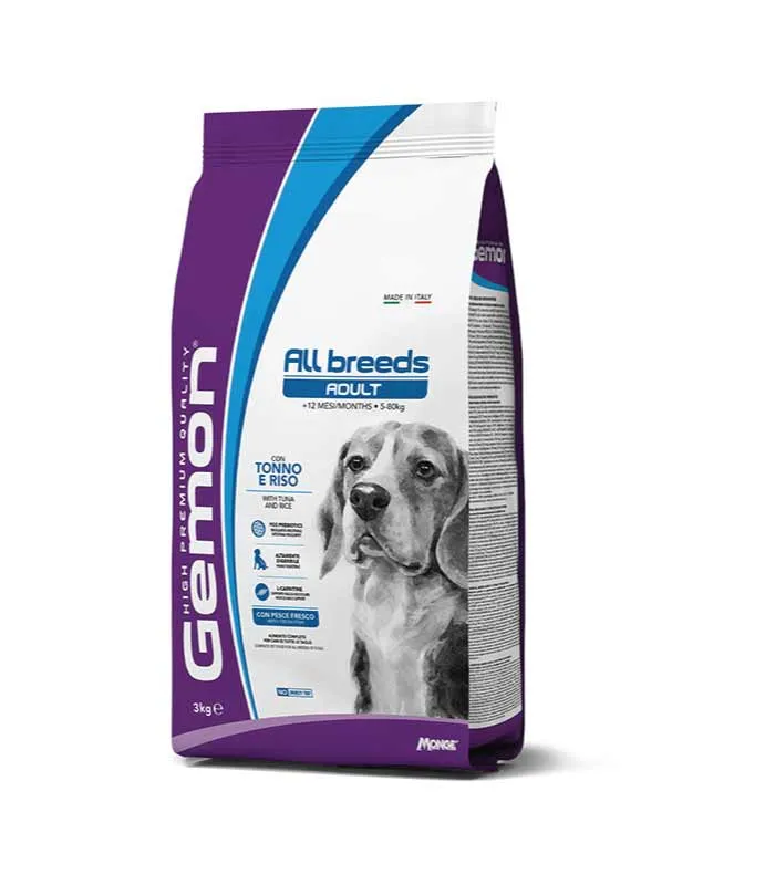 Monge Gemon sa Tunnjevinom i rižom je kompletna hrana za odrasle pse za pse svih veličina. Formulaciju karakteriziraju sastojci vrhunskog kvaliteta poput tunjevine, izvora esencijalnih hranjivih tvari, i pirinča, izvora ugljikohidrata. Recept je vrlo probavljiv zahvaljujući procesu ekstruzije. Uravnotežena ishrana sa prebioticima, kao što su frukto-oligosaharidi (FOS) i pulpa cvekle, izvor nerastvorljivih vlakana koja podržavaju pravilno funkcionisanje crevnog trakta. Sadrži svježu ribu za optimalan ukus i L-karnitin za podršku mišićne mase. Takođe sadrži yucca schidigera za ograničavanje crijevnih mirisa. Bez dodanih vještačkih boja i konzervansa.
