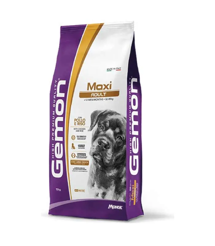 Monge Gemon Maxi Adult je kompletna hrana za odrasle pse velikih rasa. Formulaciju karakteriziraju sastojci vrhunskog kvaliteta poput piletine, izvora esencijalnih nutrijenata, i pirinča, izvora ugljikohidrata. Recept je vrlo probavljiv zahvaljujući procesu ekstruzije. Uravnotežena ishrana sa prebioticima, kao što su frukto-oligosaharidi (FOS) i pulpa cvekle, izvor nerastvorljivih vlakana koja podržavaju pravilno funkcionisanje crevnog trakta. Sadrži svježe meso za optimalan ukus i glukozamin i hondroitin sulfat za podršku zglobovima i kostima. Sadrži i yucca schidigera za ograničavanje crijevnih mirisa i pivski kvasac za bujnu dlaku. Bez dodanih vještačkih boja i konzervansa.