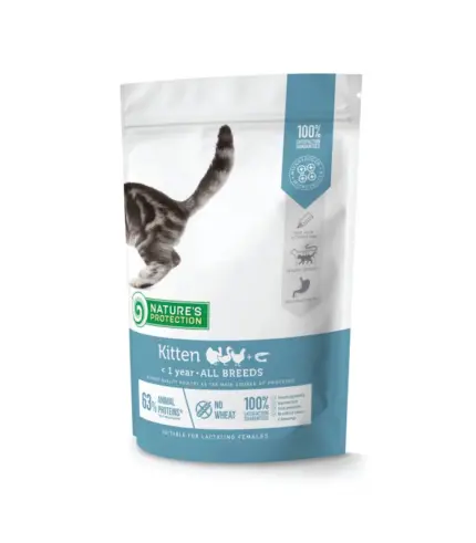 Nature's Protection Kitten za mačiće do 1 godine sa živinom i račićima je Super Premium kompletna i izbalansirana suva hrana sa najkvalitetnijim izvorom proteina i sirovinama. Sastav ove suve hrane za mačke obogaćen je sastojcima koji su savršeni da obezbjede potrebnu količinu kalorija, vitamina i minerala za razvoj i energiju mačića. Pogodno za ženke u laktaciji i može se koristiti prvo nakon majčinog mleka.
