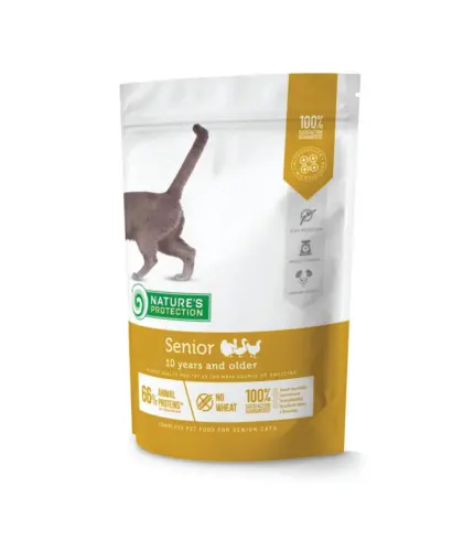 Nature's Protection Senior za mačke starosti 10 godina i starije sa živinskim mesom je Super Premium kompletna i izbalansirana suva hrana sa najkvalitetnijim izvorom proteina i sirovinama. Sastav ove suve hrane za mačke obogaćen je sastojcima koji su savršeni za obezbeđivanje neophodne količine kalorija, vitamina i minerala za opšte zdravlje starijih mačaka.