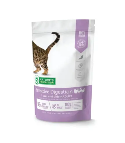 Nature's Protection Sensitive Digestion za mačke stare godinu i starije sa živinskim mesom je Super Premium kompletna i izbalansirana suva hrana sa najkvalitetnijim izvorom proteina i sirovinama. Sastav ove suve hrane za mačke obogaćen je sastojcima koji su savršeni za obezbeđivanje neophodne količine kalorija, vitamina i minerala za mačke sa osetljivom varenjem.