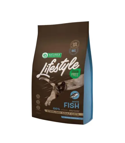 suva hrana bez žitarica za odrasle sterilisane mačke sa bijelom ribom Nature’s Protection Lifestile bez žitarica sa bijelom ribom za sterilizovane odrasle mačke je super premium, potpuna i izbalansirana suva hrana za mačke sa najkvalitetnijim izvorom proteina i sirovinama. Ova potpuna suva hrana za mačke je specijalno dizajnirana za odrasle mačke kako bi pomogla u oporavku nakon sterilizacije. Ima manje kalorija i dopunjen je inovativnim sastojcima koji pomažu u održavanju optimalne težine i smanjenju viška kilograma. Kompletan sastav ove suve hrane za mačke ne samo da će vašem ljubimcu obezbediti sve efikasne hranljive materije, već će obezbediti i savršenu svarljivost i zdrav urinarni sistem.
