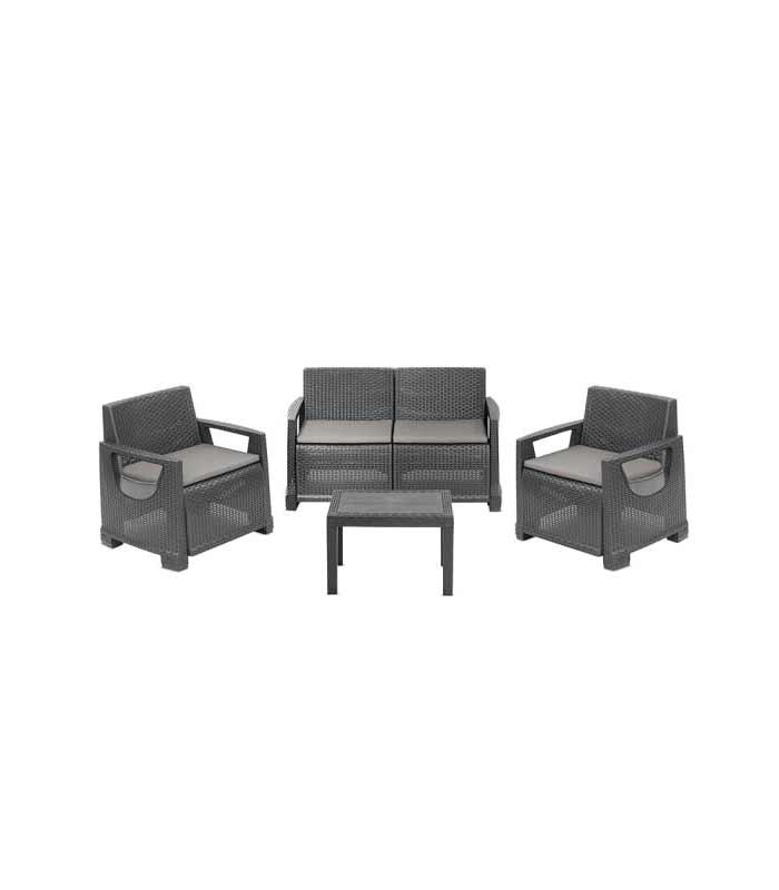 Idealan za terasu, dvorište, a takođe pogodan i za unutrašnje korišćenje. Napravljen od kvalitetnih materijala otpornih na habanje, lagan za prenošenje, vodootporan i lak za održavanje. Četvorodelni plastični set, dvije stolice, sofa, sto, ratan stil, sa četiri jastuka, udoban, prijatan za sjedenje i sa ergonomski naslonom.