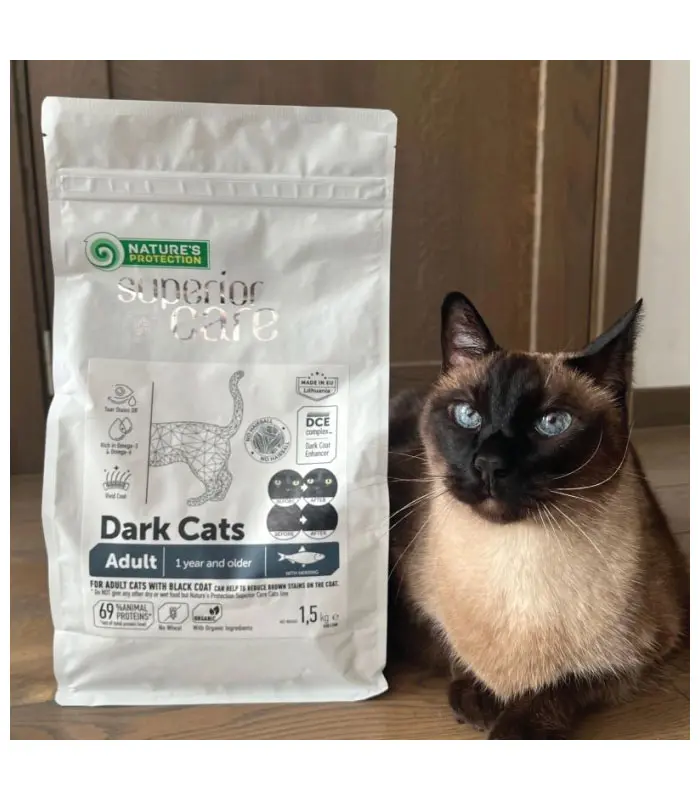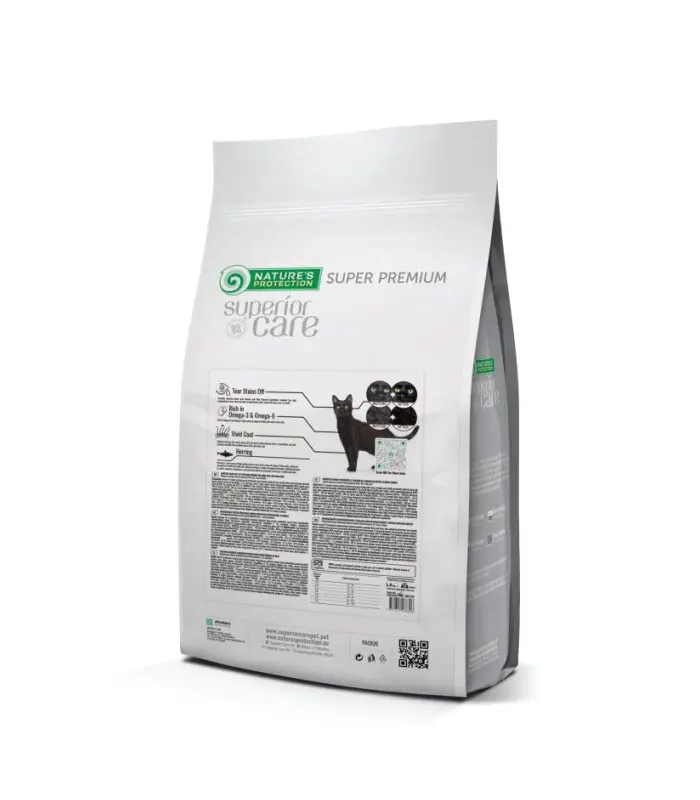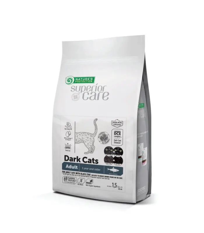 Nature's Protection Superior Care za tamne mačke bez žitarica sa haringom za odrasle mačke svih rasa je Super Premium kompletna i izbalansirana suva hrana za mačke sa najkvalitetnijim izvorom proteina. Pažljivo odabrani i dobro izbalansirani sastojci u hrani čine strukturu suza i pljuvačke providnom i pomažu u zaštiti mačje dlake od smeđih mrlja. Ova potpuna suva hrana napravljena prema specijalnoj formuli Dark Coat Enhancer (DCE), može pomoći u zaštiti i poboljšanju crnog pigmenta u dlaki vaše mačke. Kompletan sastav suve hrane za mačke obezbeđuje sve efikasne hranljive materije i obezbeđuje odgovarajuću svarljivost i ukus.