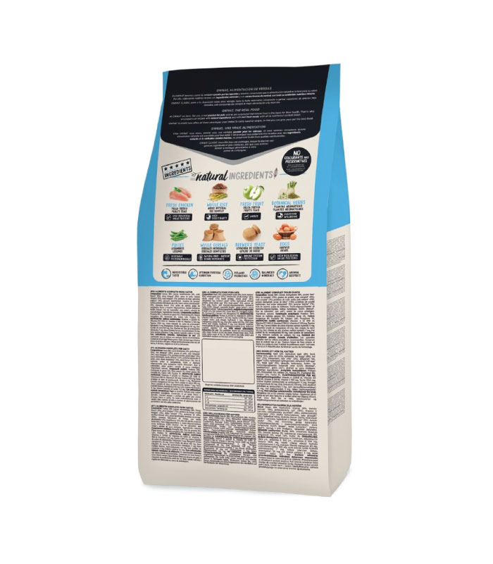Meso 38% (dehidrirano meso 28%, svježa piletina* 10% prije ekstruzije), riža cjelovitog zrna* (15%), pileća mast, cijeli ječam* (9%), cijeli kukuruz* (7%), kukuruzni proteini, cijeli grašak* (4%), dehidrirana riba, pivski kvasac* (1,5%), hidrolizirani pileći protein, sušeno cijelo jaje* (1%), jabuka* (1%), lososovo ulje, repina pulpa, frukto- i manan- oligosaharidi, aromatično bilje 0,02% (komorač*, cvijet kamilice*, zeleni anis*), yucca schidigera. *PRIRODNI SASTOJCI