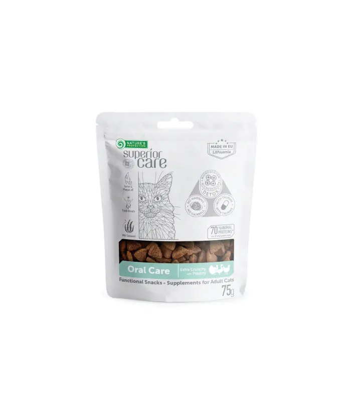 Nature's Protection Superior Care grickalice za oralnu njegu su savršene za opšte dobro i oralnu negu kućnog ljubimca. Glavni izvor proteina ovih grickalica je živina. Može biti odličan izvor visokokvalitetnih i lako svarljivih proteina za mačke. Sadrži esencijalne aminokiseline potrebne za održavanje i jačanje jakih mišića, kože i dlake. Živina je takođe bogata vitaminima i mineralima kao što su vitamin B12, gvožđe i cink, koji su važni za opšte zdravlje i dobrobit. Tekstura i oblik poslastica su dizajnirani da pomognu u održavanju dobre zubne higijene. Dopunske užine su obogaćene klinoptilolitom vulkanskog porekla iz prirode – MicroZeoGen. Pomaže u uklanjanju toksina iz tijela kućnog ljubimca, a kada se detoksikuje, efikasni hranljivi sastojci, vitamini i minerali se lako apsorbuju u telo. Sastav sadrži morske alge koje poboljšavaju efekat uklanjanja zubnih naslaga i kamenja.