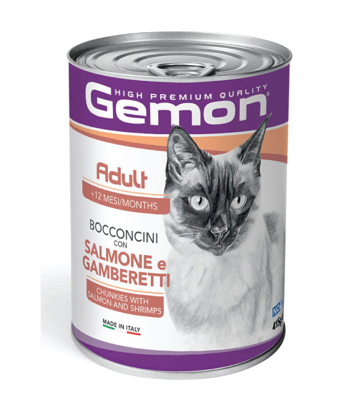 Gemon Adult Cat sa lososom i škampima je kompletna hrana  za odrasle mačke, formulisana da obezbedi sve neophodne hranljive materije za svakodnevnu vitalnost naših četvoronožnih prijatelja. GEMON HIGH PREMIUM QUALITY je linija kompletne hrane za kućne ljubimce formulisana od kvalitetnih sastojaka, odabranih da zadovolje nutritivne potrebe vaših ljubimaca. Veoma ukusni recepti, prilagođeni različitim godinama i životnim stilovima životinja. Bez dodatih vještačkih boja i konzervansa. Proizvedeno u Italiji.