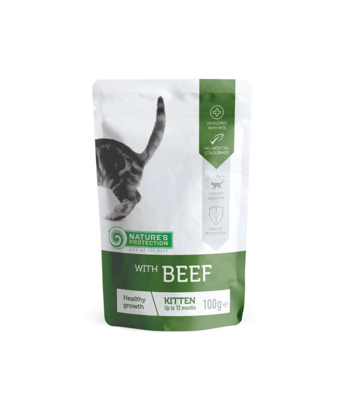 Nature's Protection Healthi Grovth je Super Premium vlažna hrana  za mačiće sa govedinom. To je kompletna hrana najvišeg kvaliteta koja se servira u ukusnom sosu i dopunjena mineralima. Glavni izvor proteina je visokokvalitetna govedina. Sastav ove vlažne hrane za mačke obogaćen je sastojcima koji su savršeni za obezbeđivanje potrebne količine kalorija, vitamina i minerala za razvoj i energiju mačića. Idealan je dodatak ishrani Nature's Protection suvom hranom. Nature's Protection vlažna hrana za mačke je skrojena da zadovolji različite potrebe mladih i odraslih mačaka. Glavni izvor proteina u ovoj hrani je meso visoke nutritivne vrednosti.