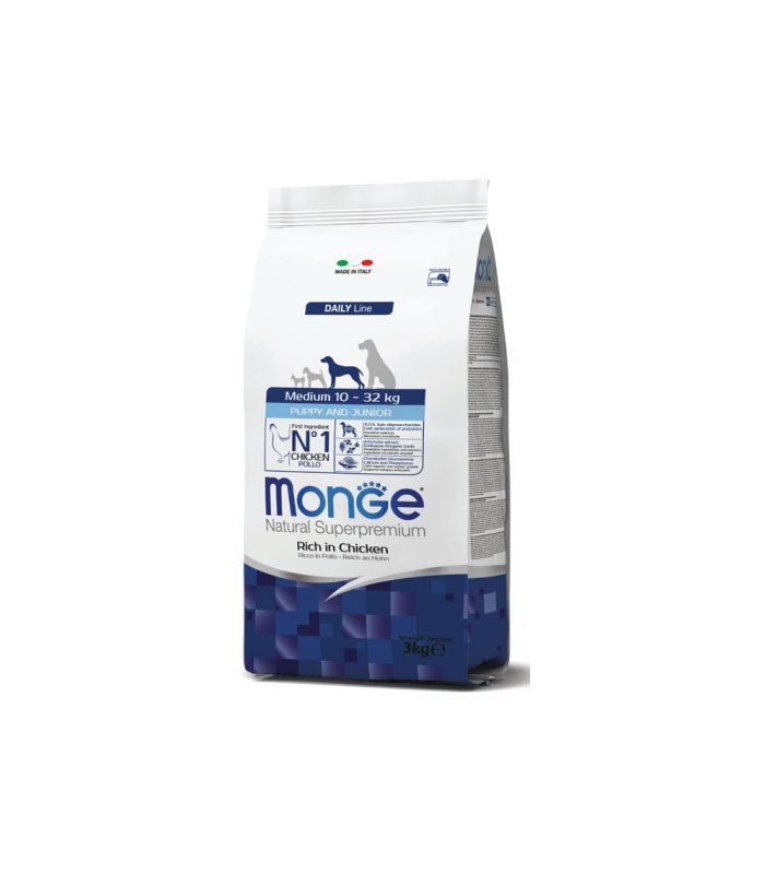 Monge Natural Superpremium Medium Puppi and Junior Rich in Chicken je kompletna hrana za kućne ljubimce za štence i mlade pse srednje veličine (10-32 kg).