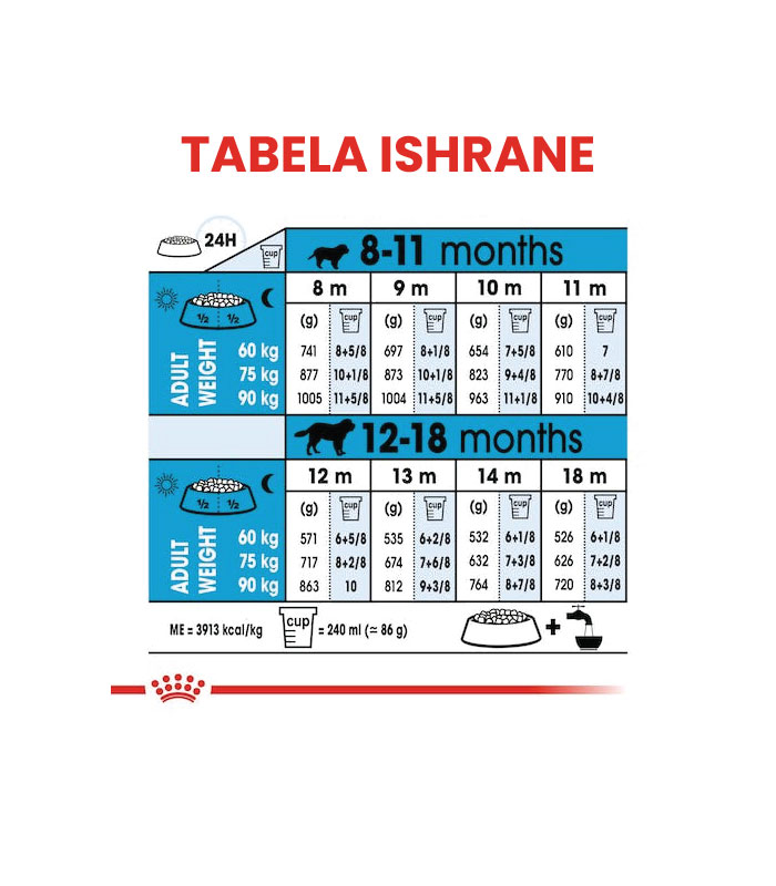 Doprinosi dobroj mineralizaciji kostiju kod štenaca divovskih rasa zahvaljujući izbalansiranom unosu energije i minerala (kalcijuma i fosfora), podržavajući tako konsolidaciju kostiju i zglobove.