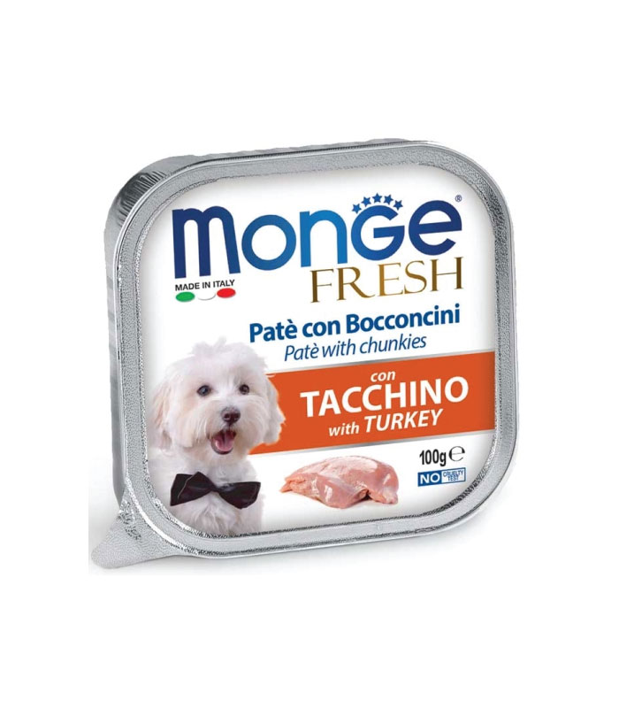 Ukusna pašteta sa svježom ćuretinom je kompletna hrana odabrana da svakodnevno podržava dobrobit vaše životinje. Recept je formulisan sa niskim sadržajem šećera i bez hidrogenizovanih masti. Meka i ukusna pašteta sa komadićima je idealna za male pse i kao poslastica za veće pse. Monge Fresh je proizveden u Italiji, bez vještačkih boja i konzervansa.