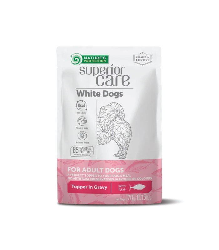 Ova komplementarna vlažna hrana je savršena za pse sa osetljivom varenjem i posebno je pogodna za pse sa bijelim krznom. Njegovi nježni sastojci pomažu u održavanju čistih struktura suza i pljuvačke i sprečavaju mrlje na dlaki. Tunjevina, primarni protein u ovoj hrani, obezbeđuje visokokvalitetne proteine i esencijalne omega-3 masne kiseline. Ovi hranljivi sastojci podržavaju zdravlje srca, smanjuju upalu i promovišu sjajnu dlaku. Tunjevina je takođe bogata vitaminima i mineralima, uključujući vitamin D i vitamine B, koji su ključni za imunološku funkciju i zdravlje mozga. Kao hranljivi dodatak, ova hrana poboljšava ishranu vašeg psa, obezbeđujući uravnoteženu ishranu i opšte blagostanje obezbeđujući esencijalne aminokiseline, vitamine i hranljive sastojke koji podržavaju bolje zdravlje, poboljšavaju varenje i povećavaju nivo energije.