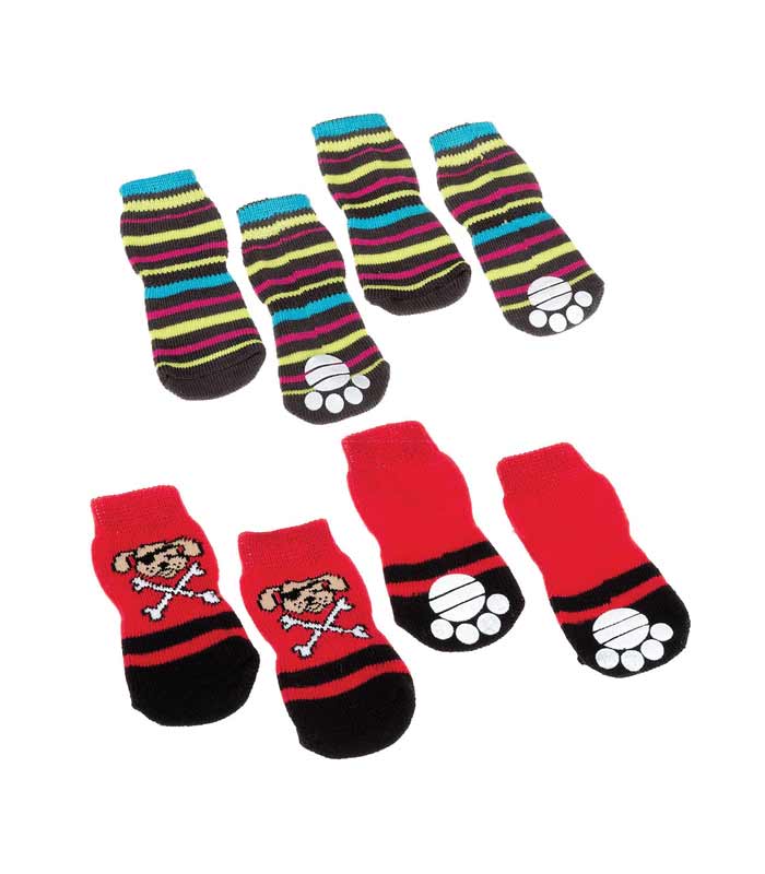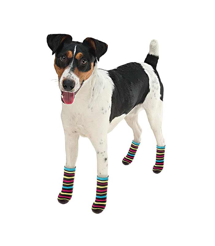 Šarene, izrađene od mekane tkanine, idealne su za zatvorene prostore i imaju vrlo korisnu površinu protiv klizanja koja vašem psu daje veliku slobodu kretanja, štiteći vaš pod i istovremeno šape vašeg četveronožnog prijatelja. Vrlo jednostavne za nošenje, ove čarape za pse  dostupne su u različitim veličinama, malim, srednjim i velikim, te u mješovitim bojama.