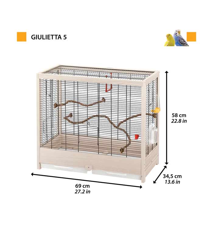 Giulietta 5 srednje veličine je pogodna za kućne kanarince ili male egzotične ptice. Takođe je opremljen dubokom drvenom podlogom sa plastičnim ladicama koje se mogu ukloniti za lako i brzo čišćenje. Mala ulazna vrata dizajnirana su za svakodnevne operacije održavanja. Kompletna sa potrebnim dodacima, Giulietta 4 je udobna i spremna da u svakom trenutku ugosti vaše pernate prijatelje: unutra ćete naći pokretne okretne hranilice, pojilicu, kopču za povrće, kao i fleksibilne plastične modularne grede koji vam pružaju veliku slobodu jer možete kreirati oblike koje želite.